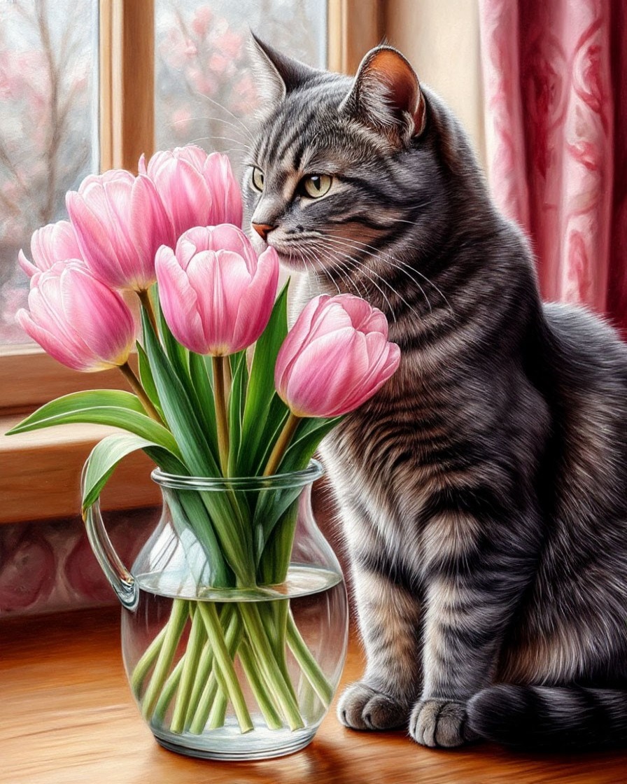 Картина по номерам "Кот и тюльпаны" 40х50см